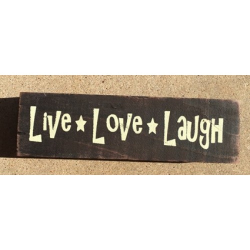 69036LLL - Live Love Laugh, measures 10 inches by 3 inches, Block is Black with white stenciled writing Live * Love * Laugh, Handmade in America, and Very Primitive