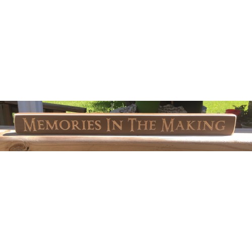 Painted Chocolate, distressed wooden block, engraved with "Memories in The Making" in bold, looping script writing.