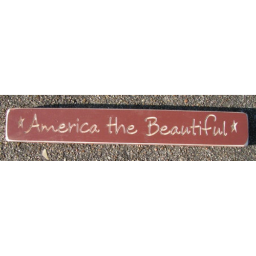 America the Beautiful sign is Painted Burgundy, distressed wooden block, engraved with "America the Beatuiful" in bold, looping script, accented w/stars. Handmade in America Size: 12"L x 1 1/2"H Finish: Sanded edges create a worn look.