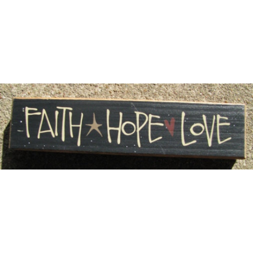 Faith Hope and Love Block is Stained on Back & Sides. The front is painted. Faith Hope & Love is Black with Cream Writing. Measures 7 inches by 1 1/2 inches Finish: Sanded edges create a worn look.