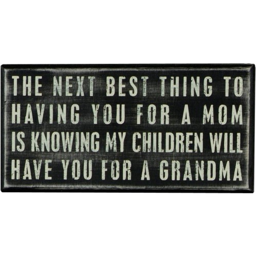 Primitive Wood Box Sign that Measures 8 inches wide by 4 inches high ,designed to freely stand on its own or hang on a wall. The box reads "The Next Best Thing To Having You For A Mom Is Knowing My Children Will Have You For A Grandma" . Black and white with sanding on surfaces, with rounded edges and corners