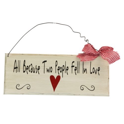 wp303- All because two people Fell in Love, measures 10" x 4". Decorative wooden plaque Has an antique look and feel to it. Has the following phrase painted on the front: All Because two people fell in love Has a red and white checkered bow and 3 red hearts painted on it