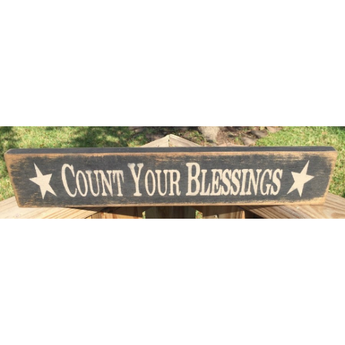 Count Your Blessings Sign is made of painted, distressed wood and features bold, white lettering and a star design. Measures 18" long by 3½" high. This sign is very Primitive. Handmade in America