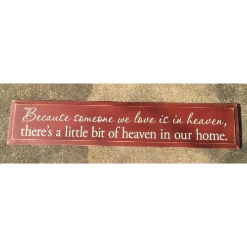 SC8050B - Someone's in Heaven Sign, The front and back of the sign is painted old burgundy and the letter color is Cream. The description of the sign is: Because someone we love is in heaven, there's a little bit of heaven in our home Size: 7x36 inches Made from solid knotty pine Beveled edges Routed slot in back for hanging Handmade in America