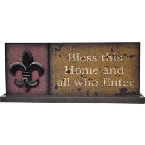Distressed wood tabletop sign with crackled look finish, features a dimensional fleur-de-lis and "Bless this Home and all who Enter" quote, measures 5 inches high by 12 inches wide, sits on a 2 inch base