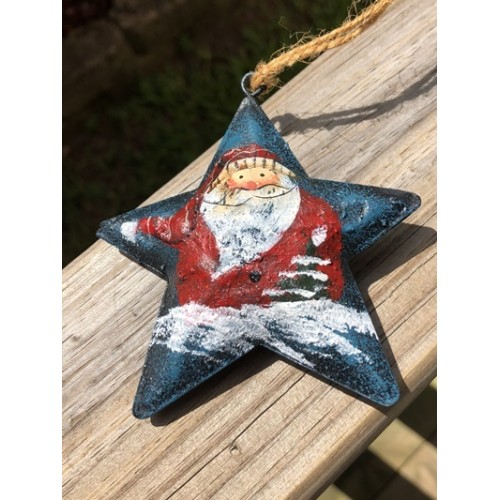 17103BST - Blue Star Santa With Red Hat, Metal, hangs by Jute and measures 3 1/2 inches in diameter.