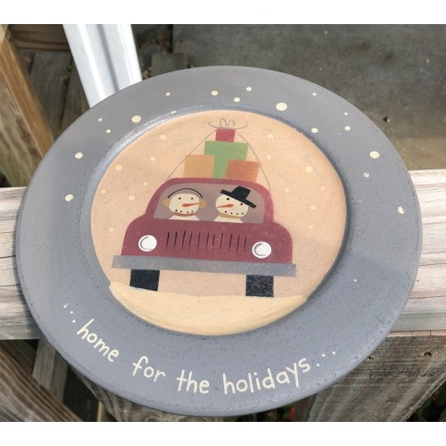 Wood Plate is made of painted snowman family scene, "Home for the Holidays." Plate measures 8-3/4 inches in diameter
