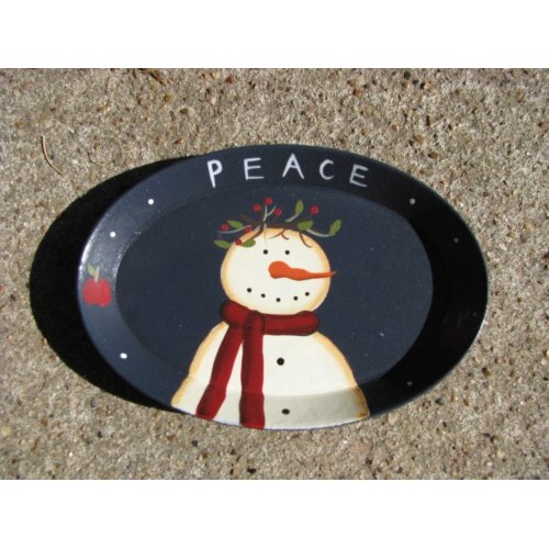 OPS-8 Snowman Peace small wood plate, measures 5 inches wide by 3 1/2 inches high.