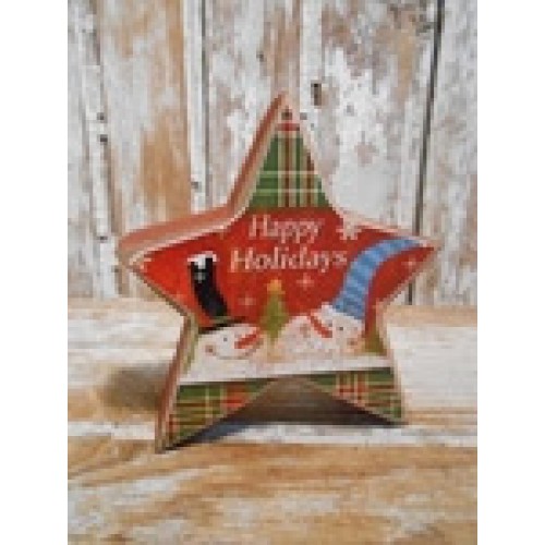 Happy Holidays 5737 Wood snowman star, measures 4 1/2 inches wide by 41/2 inches high