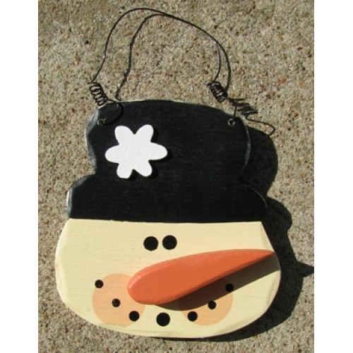 2443-71 Snowman Face on Wire, wood ornament, hangs by wire amd measures 4 1/2 inches wide by 5 inches high