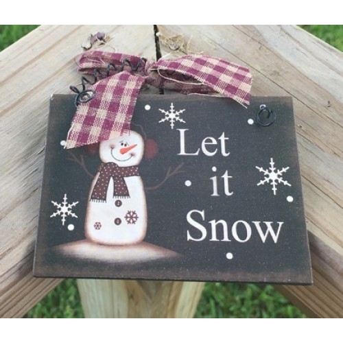 Let it Snow Snowman Sign Ornament, Measures: 2 3/4 inches high by 3 1/2 inches wide and Hangs by wire with a gingham checkered ribbon