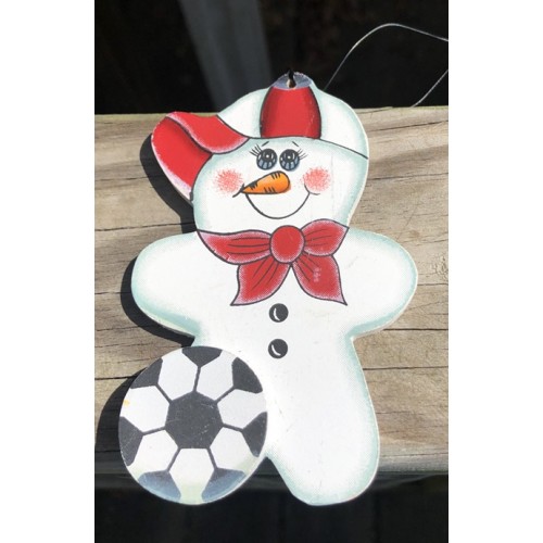 WD1058 - Soccer Snowman wood ornament, measures 4 inches high by 2 1/2 inches wide and hangs by wire
