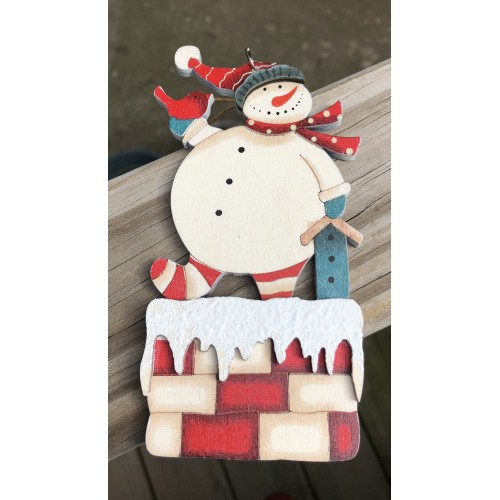 Wood Snowman Christmas Ornament. Measures 5 1/2 inches tall by 4 inches wide. Hangs by Jute. Ha..