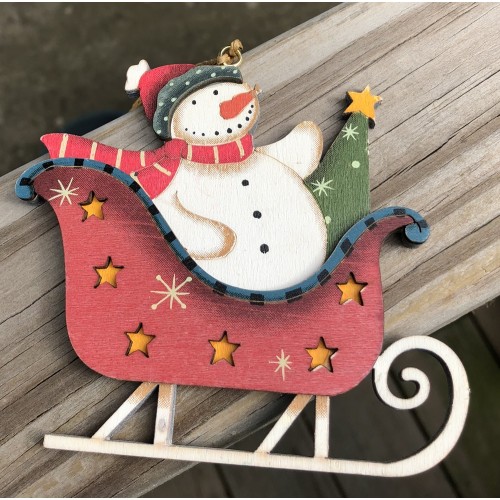 Wood Snowman in a Sleigh Christmas Ornament