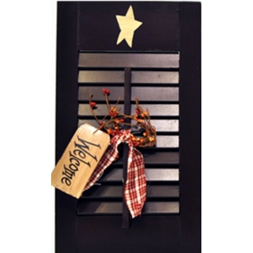45316B - Wood Shutter Black with welcome tag, berries and gingham ribbon, measures 16 inches high by 9 inches wide