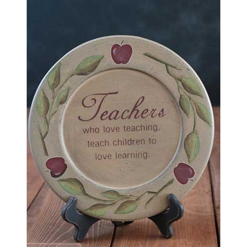 Teachers Plate. Features hand-painted apple leaves and country school houses on the rim, and a burgundy center. Reads: "Teachers who love teaching teach kids to love learning." Measures 9.75 inches. Made of hand-painted pressed-wood, distressed and aged for a rustic look. Decorative use only (don't use with food). Plate stand also available (sold separately).