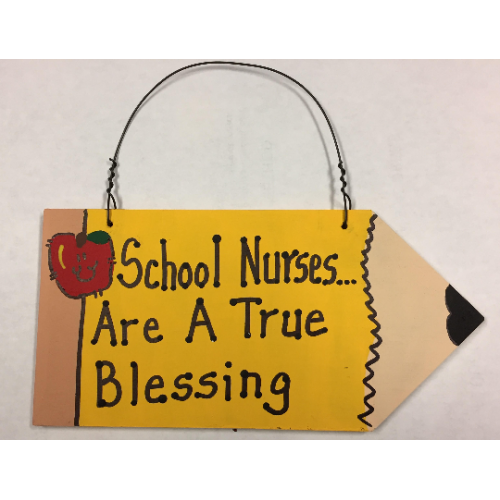 Hand Painted School Bus Yellow Apple Painted on Pencil. Hangs by wire. Size: 7 1/2"W x 3 1/4"H x 1/4" Thick Has School Nurses are a True Blessing hand written on this pencil Handmade in LaPorte, Texas