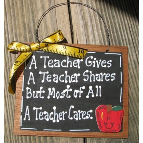 Written on the slate is A Teacher Gives A Teacher Shares But Most of All A Teacher Cares".