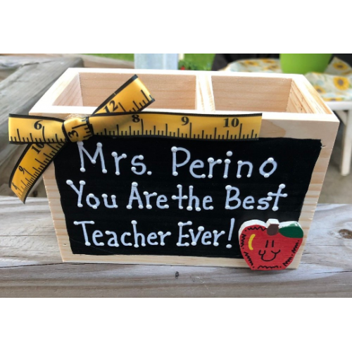Teacher Supply Box for Pens, Ruler, Scissors, etc. Squared Box with divider to organize your supplies all in one place. Supplies Not Included Example Only. Size : 6"L x 4"H x 3 inches deep. Made out of solid wood, weighs over 14 ounces when packed. Handmade in La Porte, TX