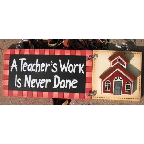 90856R Teacher's Work is Never Done wood sign, measures 11 1/4 inches wide by 5 3/4 inches high. and hangs by wire