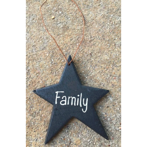 Black Star Ornament with Family written on the star. It's wired to Hang.