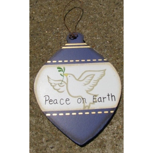 wd854 - Peace on Earth Wood Christmas Ornament Hangs by wire and measures 4 inches high by 3 inches wide