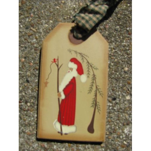 31617T-Santa Wood Gift Tag measures 3 1/2 inches high by 2 1/2 in hes wide, hangs by gingham ribbon