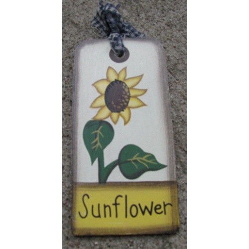 1448 Sunflower Wood Gift Tag Measures 4 3/4" x 2 1/4" x 1/8" Hangs by Gingham Ribbon