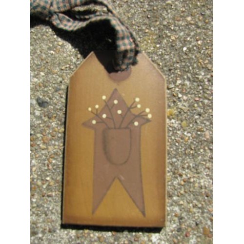 Primitive Star Wood Gift Tag Measures 3 1/2" high x 2 1/2 inches Hangs by Gingham Ribbon