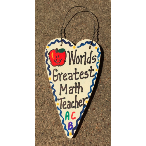 Hand Painted Teacher Gifts Says Worlds Greatest Math Teacher Long Heart with w/Apple Hangs by Wire. Measures 6 inches high by 4 inches wide. Hangs by wire and Handmade in Texas