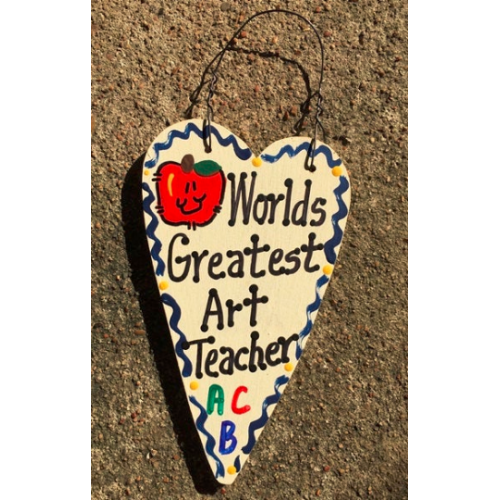 Hand Painted Teacher Gifts Says Worlds Greatest Art Teacher Long Heart with w/Apple Hangs by Wire. Measures 6 inches high by 4 inches wide. Hangs by wire and Handmade in Texas