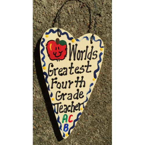 Hand Painted Teacher Gifts Says Worlds Greatest Fourth Grade Teacher Long Heart with w/Apple Hangs by Wire. Measures 6 inches high by 4 inches wide and Handmade in Texas