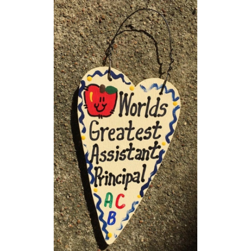 Hand Painted Teacher Gifts Says Worlds Greatest Assistant Principal Long Heart with w/Apple Hangs by Wire. Measures 6 inches high by 4 inches wide and Handmade in Texas