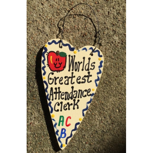Hand Painted Teacher Gifts Says Worlds Greatest Attendance Clerk Long Heart with w/Apple Hangs by Wire. Measures 6 inches high by 4 inches wide and Handmade in Texas