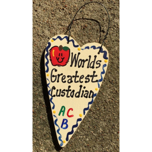 Hand Painted Teacher Gifts Says Worlds Greatest Custodian Long Heart with w/Apple Hangs by Wire. Measures 6 inches high by 4 inches wide and Handmade in Texas